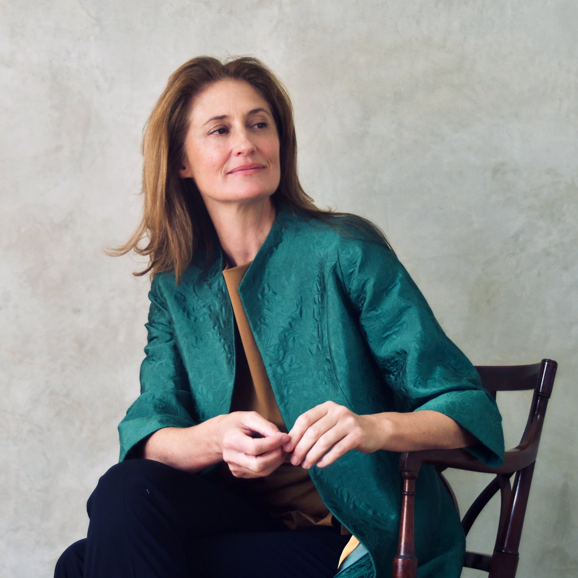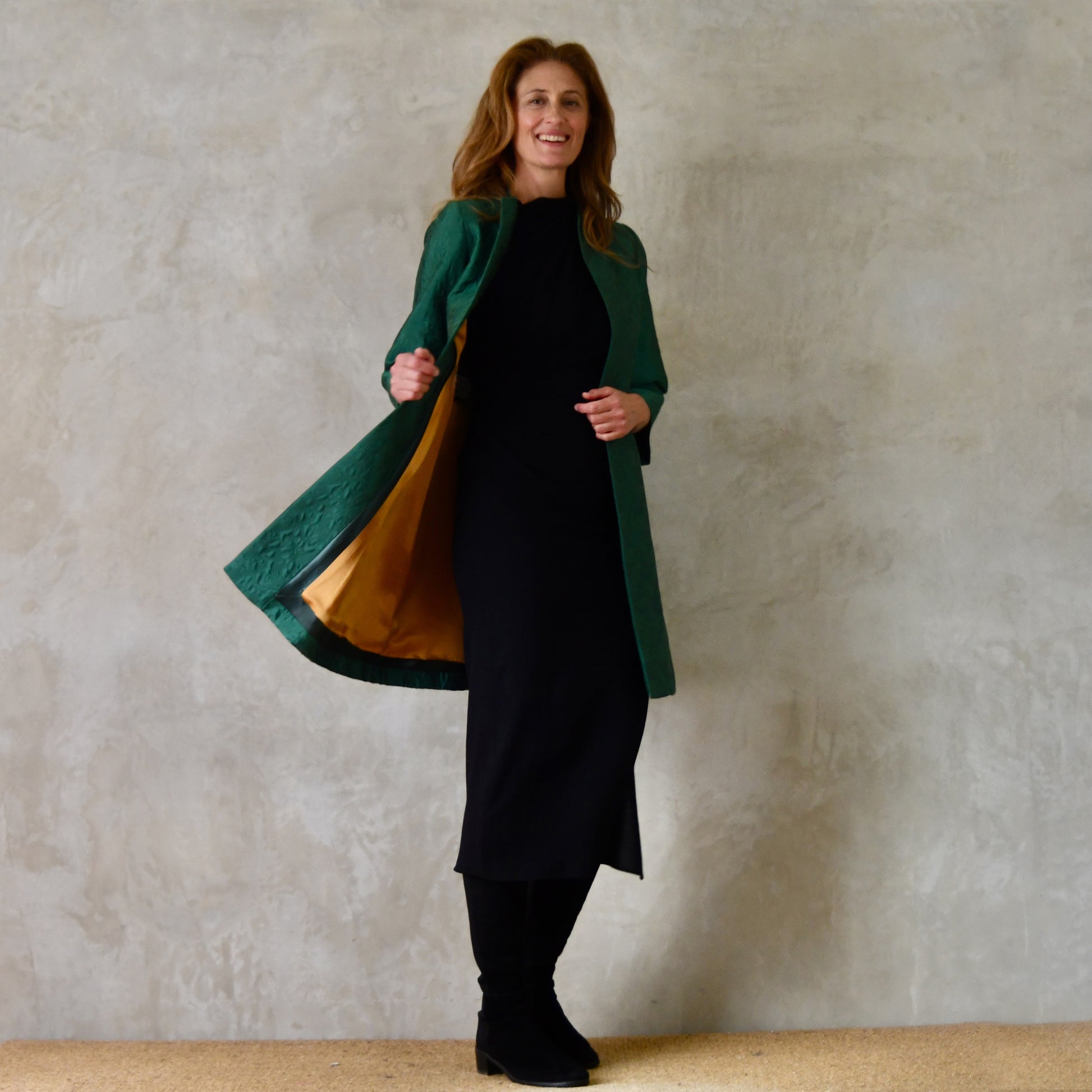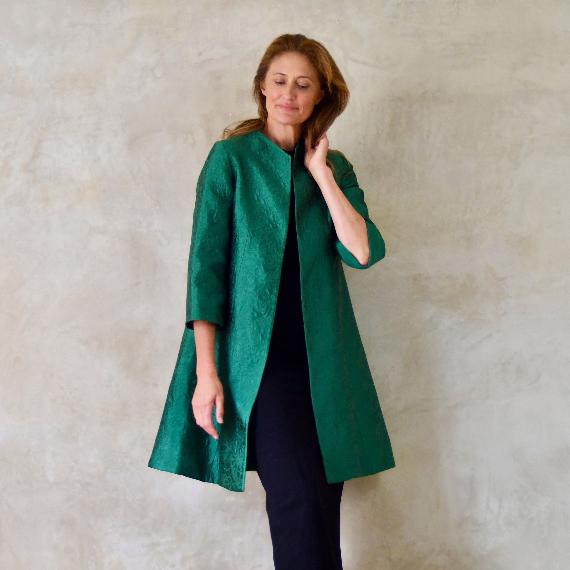 The Ganz Coat in size 8 made up in a wonderful emerald green self-patterned flower brocade – a fabric that is at once both subtle and stunning.
