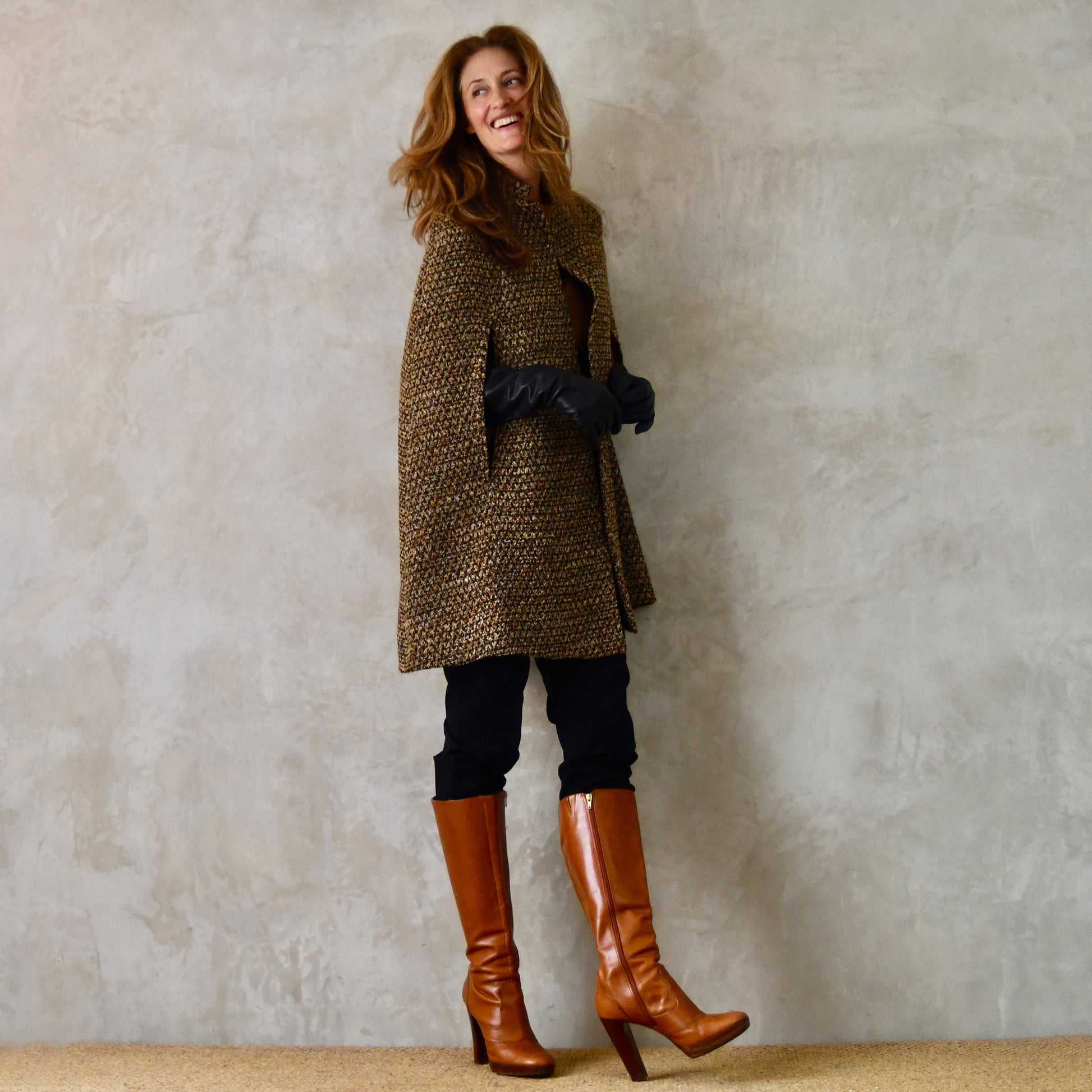 The Long Clayton Cape in Golden Brown, Black and Camel Boucle