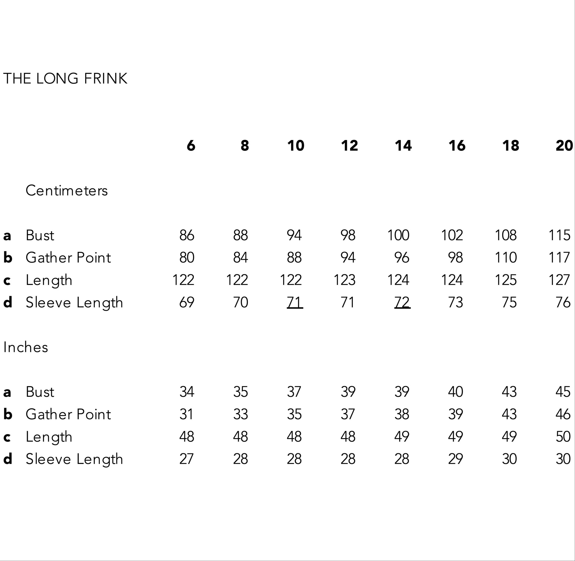The Long Frink gathers loosely under the bust with gentle tucks at both front and back. Hidden pockets nestle at the side seams.